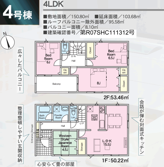 一階:50.22u。二階:53.46u。R07SHC111312号。ルーフBAL除外面積:95.58u。BAL面積:8.10u。ゴミ置場・道路持分1/18。南向きバルコニー。南道路。独立した和室。