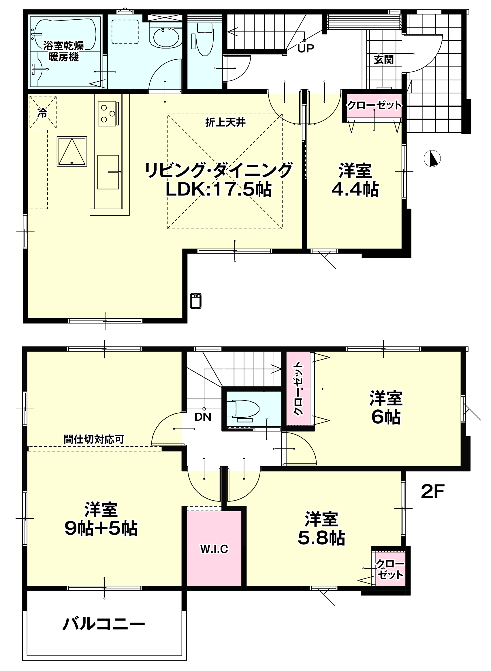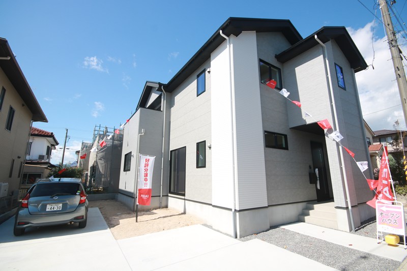 第HPA-25-06269-1号。幼稚園・小学校通園通学便利。全室洋室。リビング横に洗面脱衣室。二階の洋室14帖がツードア仕様で、壁を建設すると5LDKへ。主寝室にWIC。 |