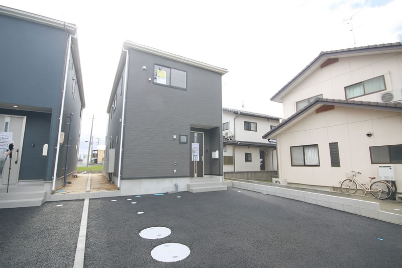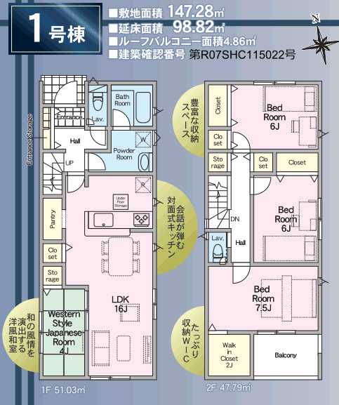 西側隣地水路越境有り。一階:51.03u。二階:47.79u。R07SHC115022号。主寝室にWIC。リビングに続く和室。キッチン横にパントリー。制震装置「SAFE365」搭載。住宅性能表示制度5分野7項目における最高等級取得。 |