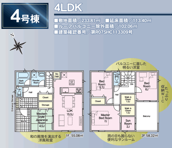 一階:55.08u。二階:58.32u。R07SHC113309号。ルーフバルコニー除外面積:102.06u。開発道路持分1/6有。二階に南向きサンルーム。WICが二ヵ所。収納豊富。住宅性能表示制度5分野7項目最高等級取得。 |