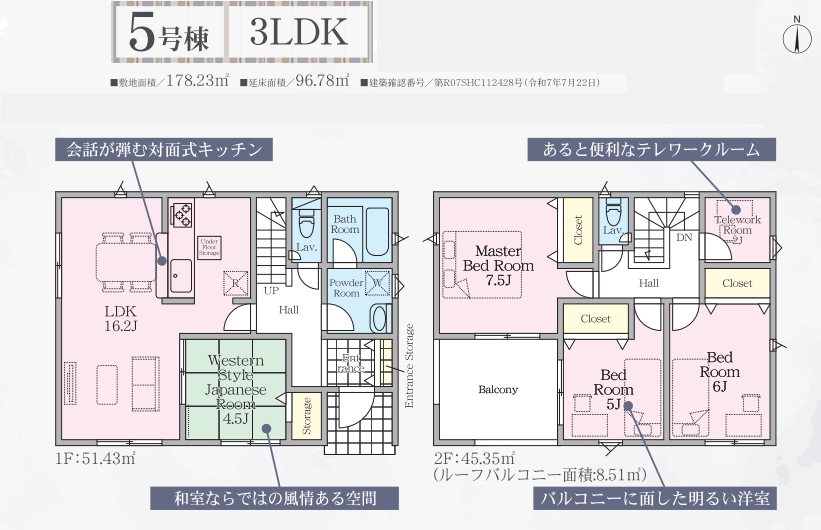 一階:51.43u。二階:45.35u。R07SHC112428号。ルーフバルコニー8.51u。全5区画。給排水用地持分1/2有。全居室南向き。日当たり良。玄関から直接、洗面室・階段・トイレへ移動可能。二部屋に接する南向きインナーバルコニー。 |