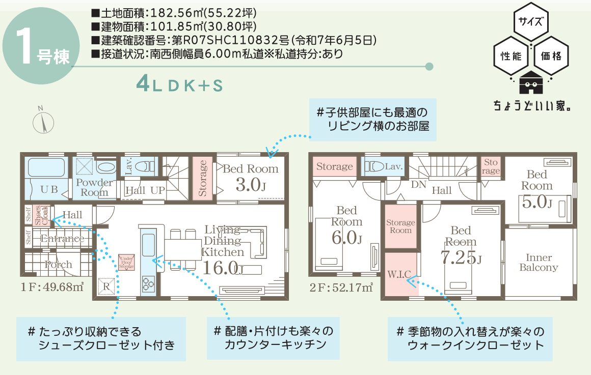 住宅性能表示制度7項目において最高等級を取得。間口:3.65m。一階:49.68u。二階:52.17u。R07SHC110832号。二階全居室南向き。二階にストレージルーム。主寝室にWIC。全室洋室。 |