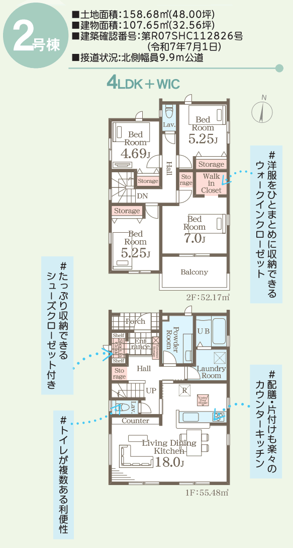 一階:55.48u。二階:52.17u。R07SHC112826号。玄関にSIC。kururi採用物件。洗面室をランドリールームが分かれて使い勝手良。キッチンはIHコンロ。二階に四部屋洋室。全室洋室。35年住宅保証システム。 |