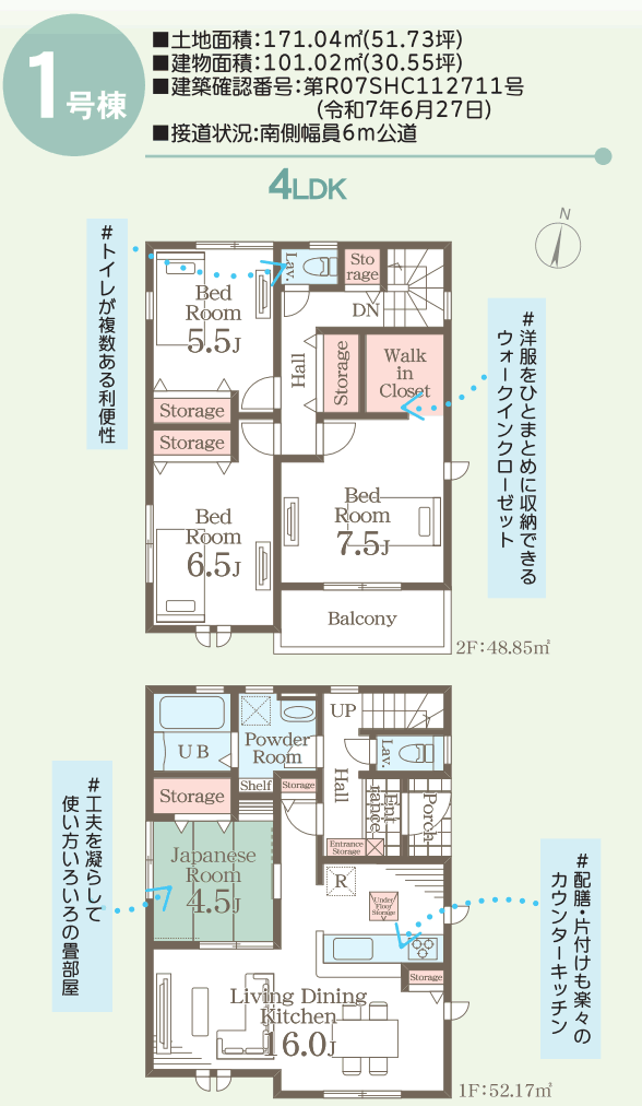 一階:52.17u。二階:48.85u。第R07SHC112711号。国道4号線へアクセス良。リビングに続く和室。収納豊富。主寝室にWIC。