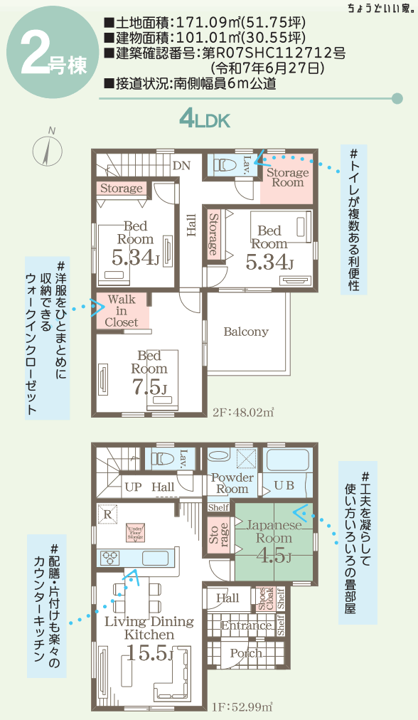 一階:52.99u。二階:48.03u。第R07SHC112712号。国道4号線へアクセス良。二階にストレージスペース。収納豊富。玄関にSIC。主寝室にWIC。
