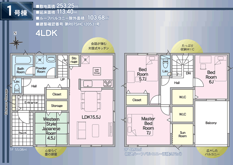 一階:55.08u。二階:48.60u。R07SHC120531号。ルーフバルコニー面積:9.72u。WICが二ヵ所。サンルーム有。南向きのバルコニー。住宅性能表示制度7項目で最高等級取得。告知事項:65年前に前所有者の祖父が自殺(縊死)してます。 |