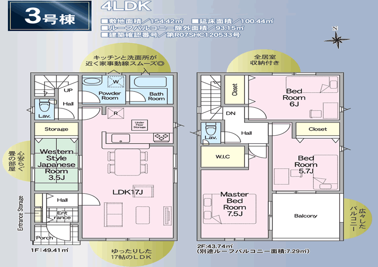 一階:49.41u。二階:43.74u。R07SHC120533号。ルーフバルコニー面積:7.29u。住宅性能表示制度7項目で最高等級取得。告知事項:65年前に前所有者の祖父が自殺(縊死)してます。 |