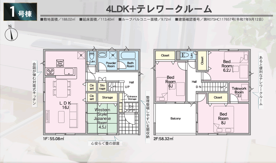 一階:55.08u。二階:58.32u。R07SHC117657号。ルーフBAL9.72u。北側水路。二階にテレワークルーム二帖。奥行きの有るリビングに続く和室。住宅性能表示制度5分野7項目最高等級取得。 |