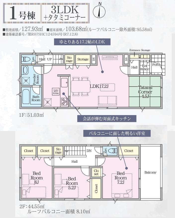 一階:51.03u。二階:44.55u。R07SHC124594号。ルーフバルコニー除外面積:95.58u。ルーフバルコニー:8.10u。開発道路持分1/6有。北東角地。玄関にシューズ東向きBAL。二階全居室南向き。リビングにタタミコーナー。制振装置「SAFE365」搭載 |