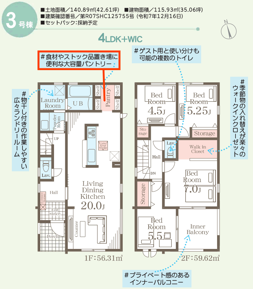 新間取りプラン「Kururiくるり」採用。一階:56.31u。二階:59.62u。第R07SHC125755号。パウダールーム・ランドリールーム・パントリー。住宅性能評価制度6項目最高等級。地盤保証20年。 |