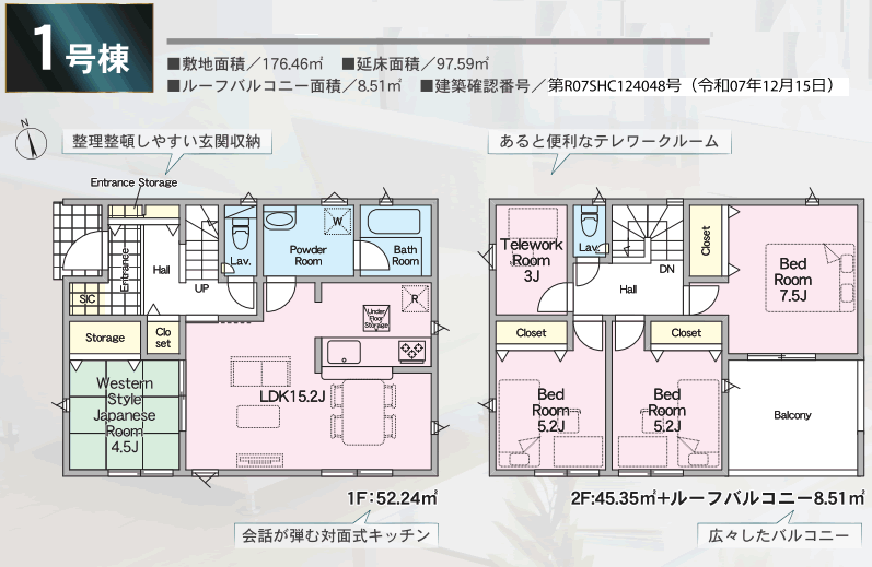 北西角地。全居室南向き。二階にテレワークルーム3帖。一階:52.24u。二階:45.35u。ルーフバルコニー:8.51u。R07SHC124048号。位置指定道路・未利用地・水路:各持分1/5有り。郡山駅徒歩圏内 |
