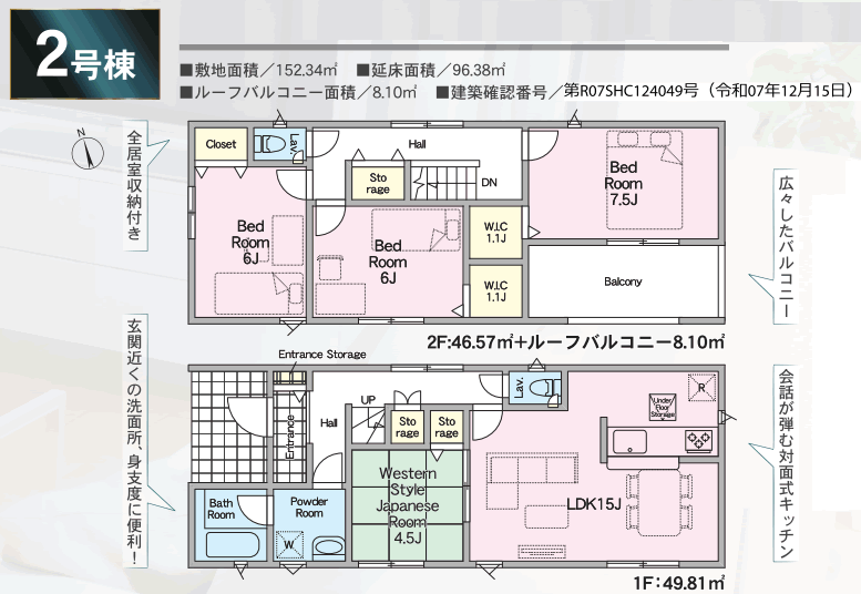 全居室南向き。二階にWICが二ヵ所。一階:52.24u。二階:46.57u。ルーフバルコニー:8.10u。R07SHC124049号。位置指定道路・未利用地・水路:各持分1/5有り。郡山駅徒歩圏内 |
